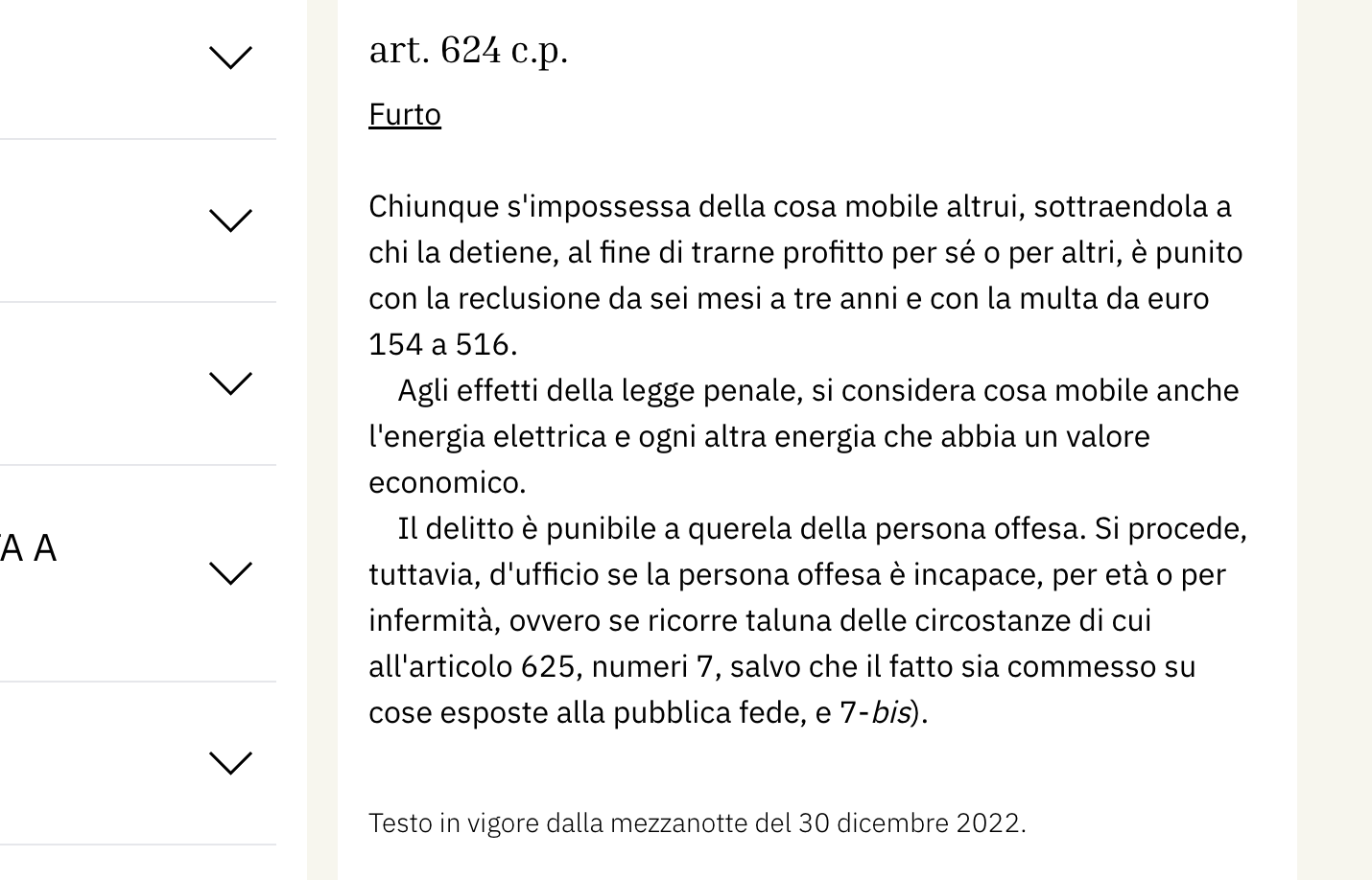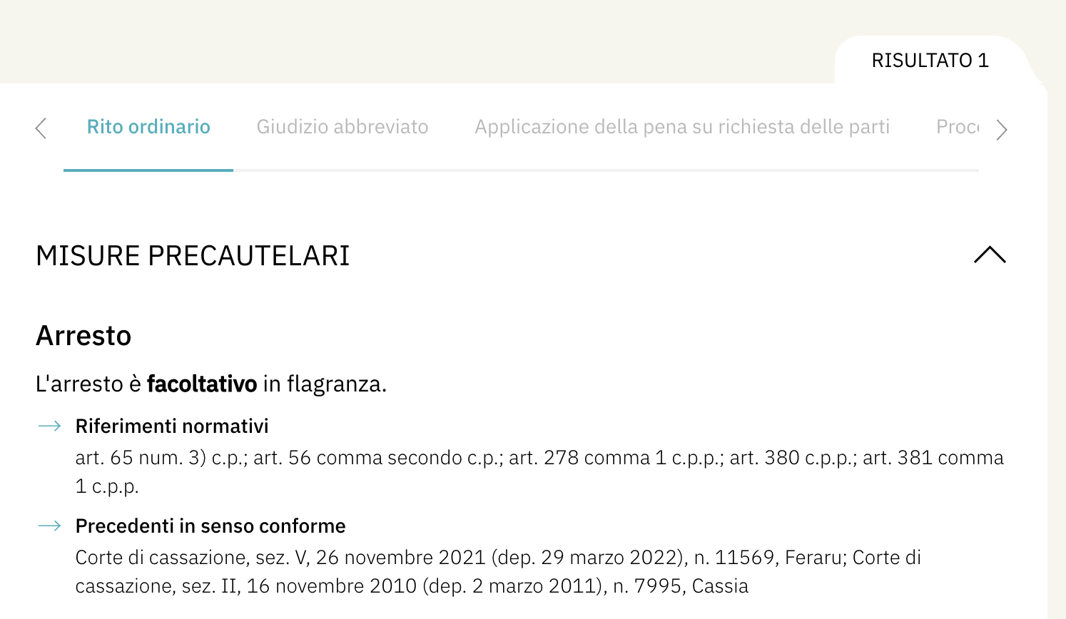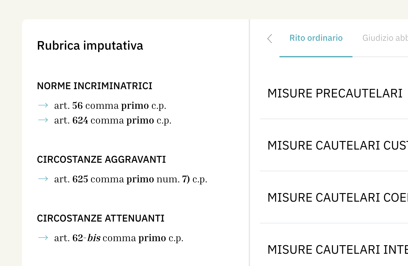 Cerca un qualsiasi capo d'imputazione e ottieni immediatamente tutte le informazioni essenziali, sostanziali e procedurali sui reati che ti interessano.